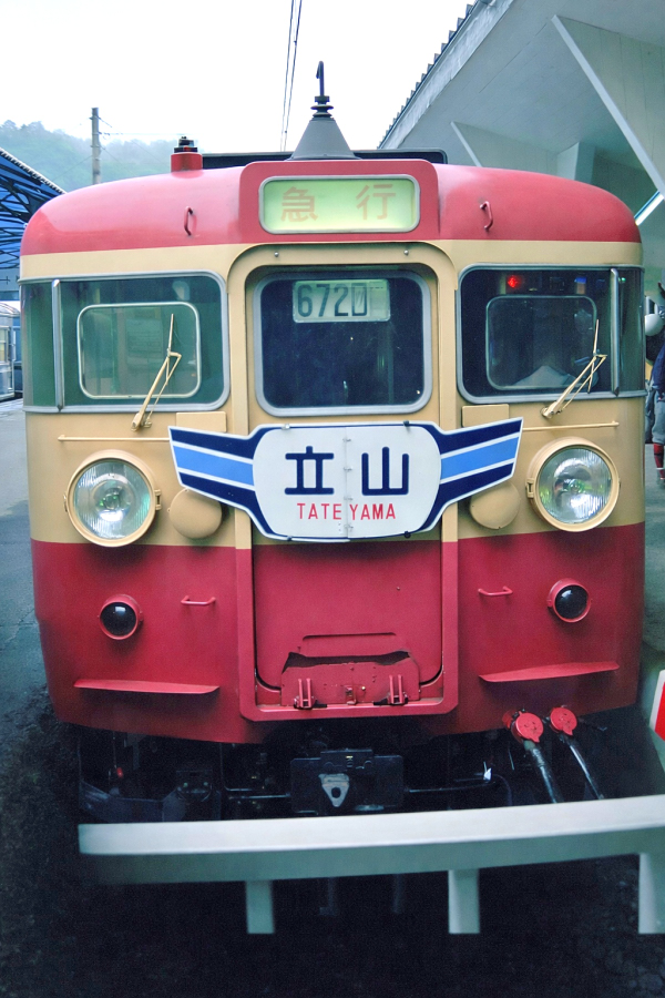 大阪 110サイズのポケットカメラによる当鉄道局最古の鉄道写真。大形ヘッドマークを付けた急行[立山]。このときは夏休みの家族旅行で三方五湖に出掛けましたが,台風の直撃を受けて小浜線が不通になり散々でした。 (2023/07/06ワイド化 2026/03/24 Google Nano Banana 2にてノイズ除去) |