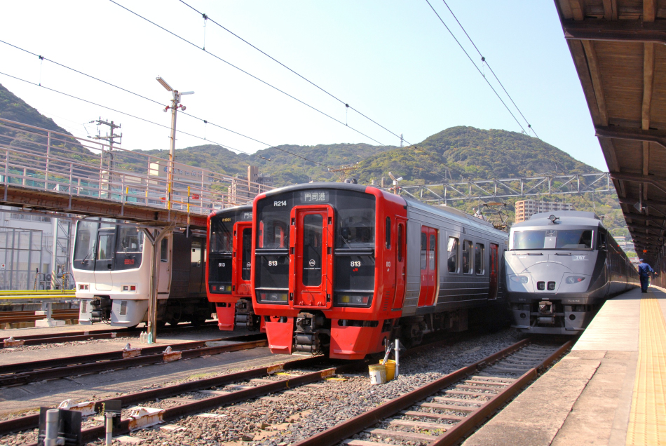 RM214 門司港/奇 クハ813‐214+サハ813‐214+クモハ813‐214 RM1001 門司港/奇 クハ813‐1001+サハ813‐1001+クモハ813‐1001 門司駅構内で811系,787系に挟まれた813系R1001編成とR214編成 |