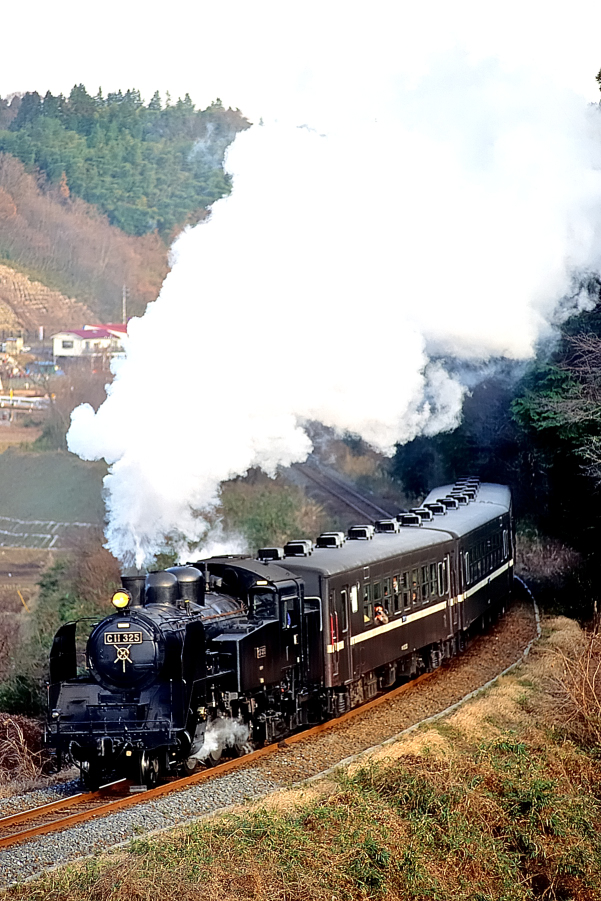 | No.385‐16 1999年1月4日 C11 325+50系3B 6001レ SLもおか号 真岡鐵道 市塙→笹原田 勾配を登るC11325。この年はこの列車からスタートとなりました。 (2007/07/07再スキャン 2022/10/19ワイド化) |