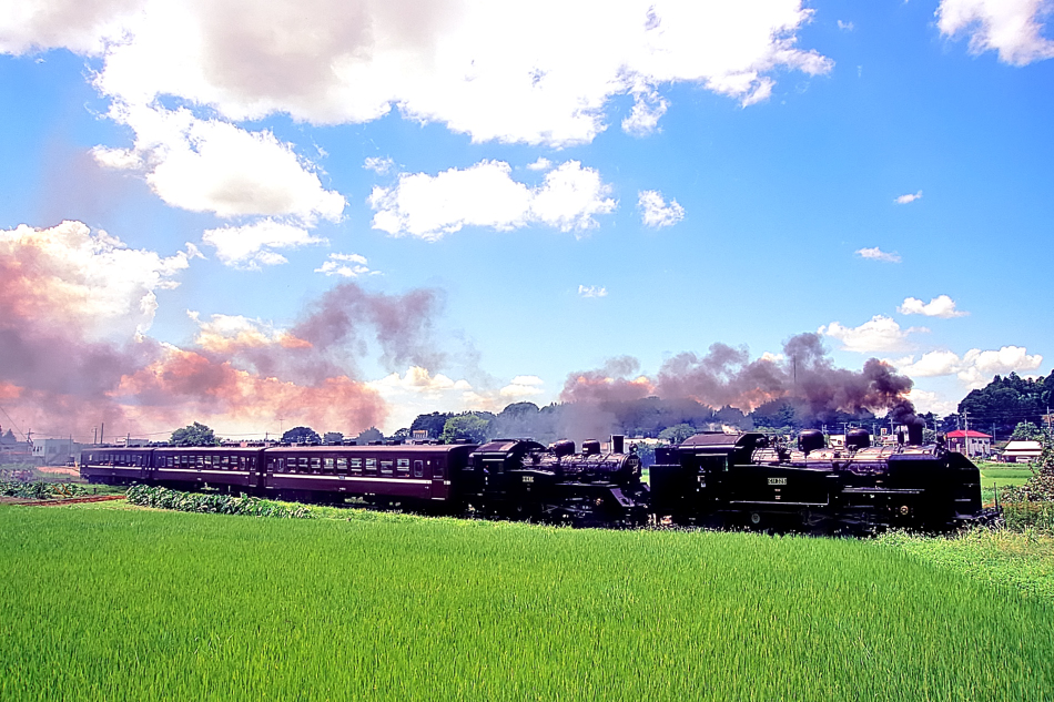夏空の下をゆく重連列車。C11とC12では車格が随分違います。28mm。 (2004/11/21再スキャン 2022/10/19ワイド化) |