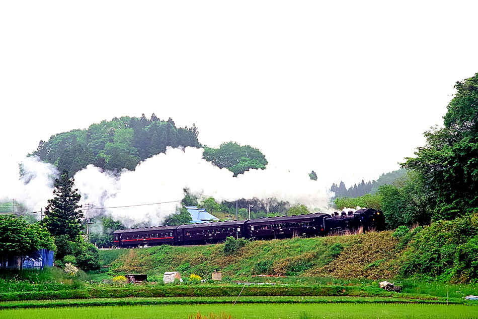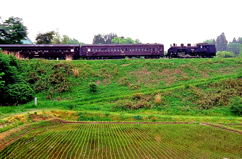 思わぬカメラのアクシデントでSWを何度かON/OFFして何とかこのショットが切れました。下の田んぼを水鏡にするよう準備していたのですが,焦ってNGでした。C11は白煙を上げているのですが,曇天に溶け込んでしまいアウト。 (2007/07/07再スキャン 2022/10/19ワイド化) |