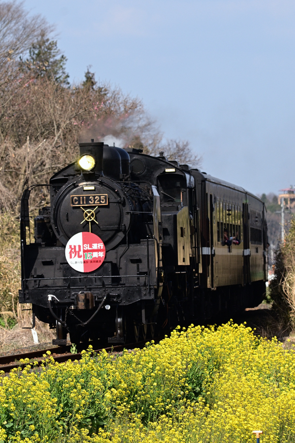 | No.D200_090405‐39 2009年4月5日 C11 325+50系3B 6002レ SLもおか号 真岡鐵道 多田羅←市塙 返しは春らしく菜の花を入れました。この区間,煙は出ませんでした。 (2009/04/11追加 2022/10/19ワイド化) |
