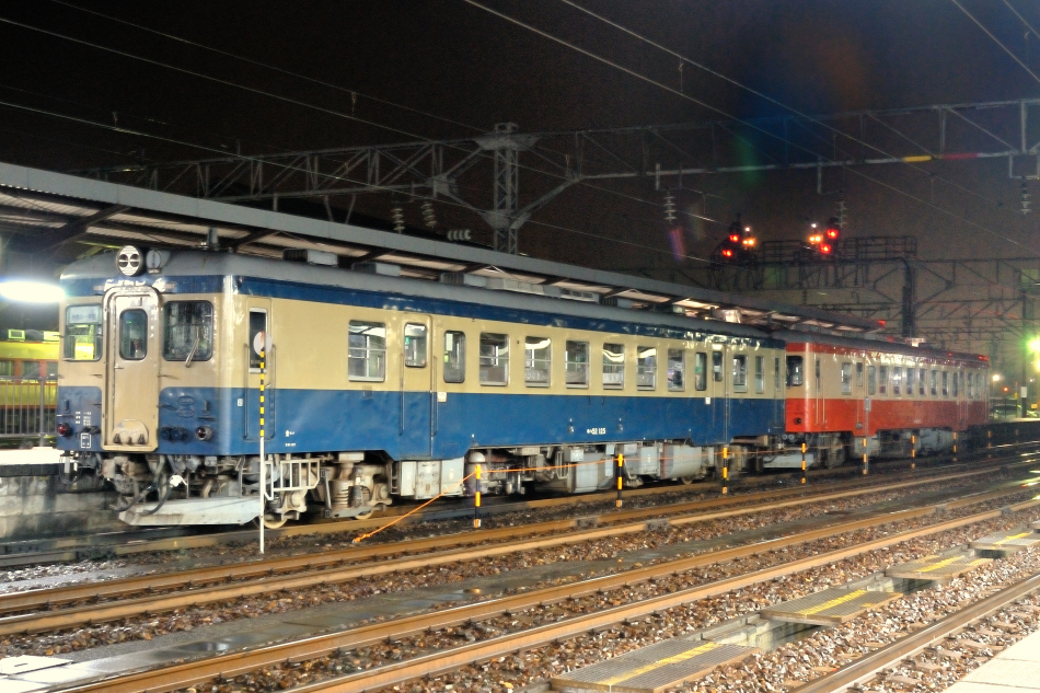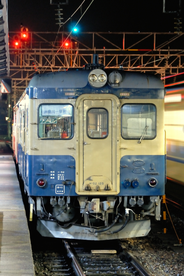 糸魚川構内で待機するキハ52。急行能登で早朝4:40に到着した折のバルブ撮影。能登の指定席は満席だったのですが,Webで毎日チェックしていた息子が,△になった瞬間,最寄り駅に走って押さえました。しかし,予想に反し自由席は空いていましたので,そちらへ移動。高崎からはシートを回転し足を伸ばして仮眠をとり,無事糸魚川に到着しました。 (2010/03/06追加 2022/07/13ワイド化) |