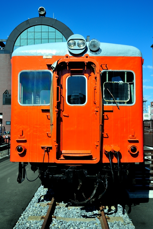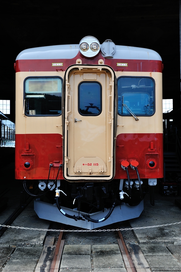 | No.D700_190810‐040 2019年8月10日 キハ52 115 津山まなびの鉄道館 扇形車庫での展示なので正面しか撮影できません。目線の高さから。 (2019/09/29追加) |