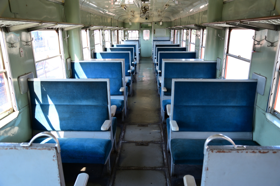 ボックス席が並ぶ車内。中央部窓側の排気管が特徴。 (2013/12/25追加 2022/07/13ワイド化) |