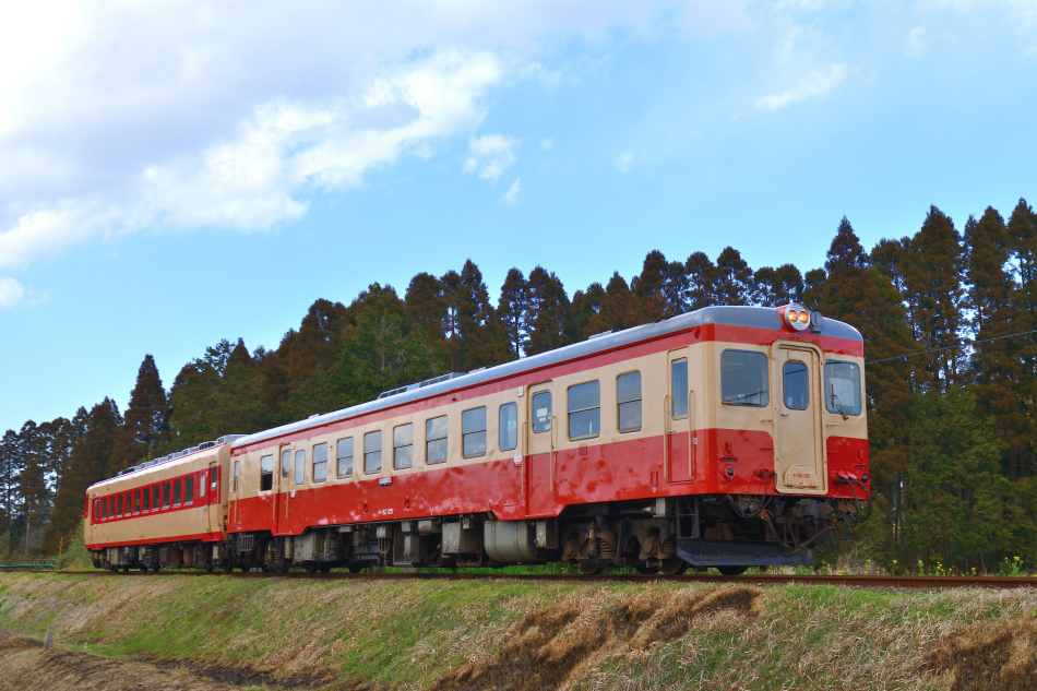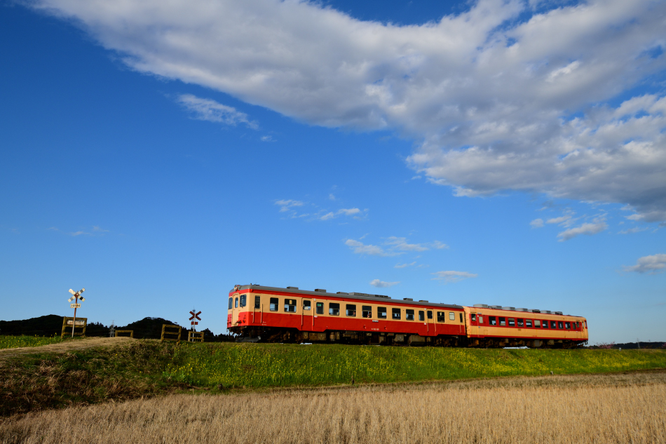 大多喜での20分停を利用して千葉で一番有名な踏切へ先回り。ようやく晴れて来たので右側の菜の花の築堤で構えていたのですが,せっかくなので踏切を入れて撮ってみました。追い写しですが,なかなか良い感じ。もう少しアングルを下げて踏切が空に浮かぶようにしたかったですが,実はこの前に大勢しゃがんでるので無理w。大人気。晴れるとD850は非常に良い色を出してくれます。 (2022/07/12追加) ![]() |