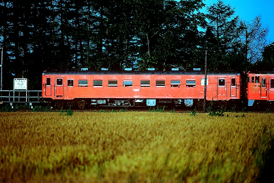 これも廃止路線の松前線での1枚。函館を7:06に出た721Dは木古内に8:15に到着し,江差行きを分割,松前行きは4821Dとなって,この千軒で9:27に4828Dと交換,というシーン。松前線は木古内−松前間50.8キロの路線でしたが,1988年2月1日付けで廃止されました。Googleマップの航空写真で千軒駅の痕跡が確認できました。 (2010/01/15追加 2022/07/11ワイド化) ![]() |