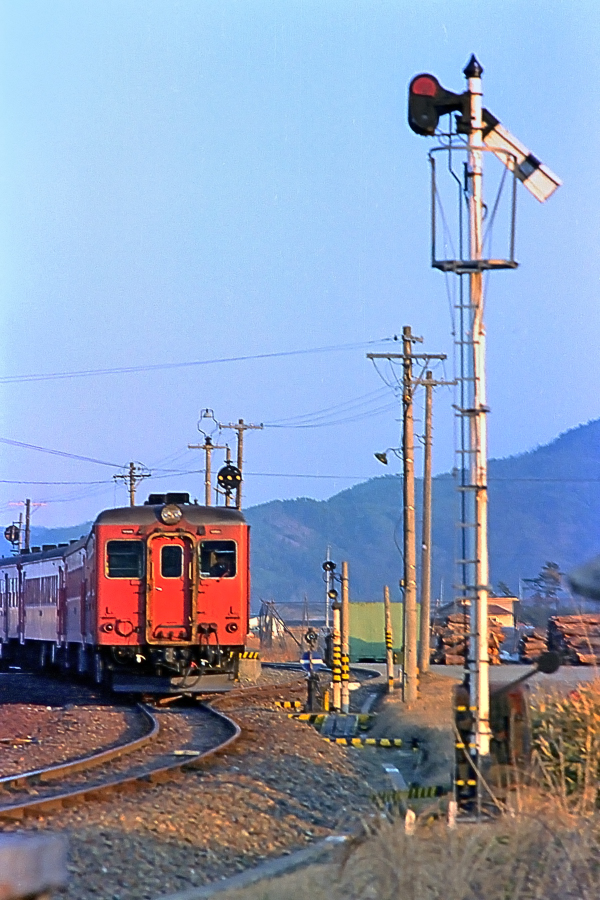 | No.N8205‐22 1982年3月10日 キハ22+キハ26+キハユニ26 大船渡線 竹駒←陸前高田 陸前高田を出るキハ22先頭の普通列車。貴重な腕木式信号を入れて撮りましたがちょっと中途半端でした。 (2009/12/13追加 2022/07/13ワイド化) |