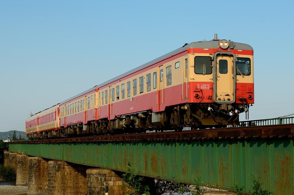 会津若松 キハ52 137+キハ52 127+キハ28 2371+キハ58 1022 新津 今回は3時過ぎに自宅を出て,9月末に新製投入されたETC・ナビ付きの新車で安田ICへ。現場には6時半と,ナビより1時間早着しましたが,DD53の再来かと思う程のパニックで,またもやかぶりつきのアングルになりました。3年前はキハ52のスノープロウが橋げたにかかった反省を活かして,ハスキー三脚を伸ばし脚立に乗って撮影しました。もっとも,あまり上げても反対サイドの柵やケーブルが入るので難しい。 (翌日追加) ![]() |