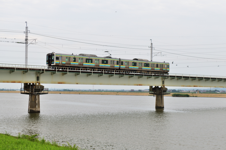 鹿島神宮/奇 クモハE131‐81+クハE130‐81 佐原 鹿島線の佐原‐鹿島神宮間に充当されているE131系が常陸利根川を渡るシーン。写真のR11編成には線路モニタリング装置を搭載しています。 (2025/06/10追加) |