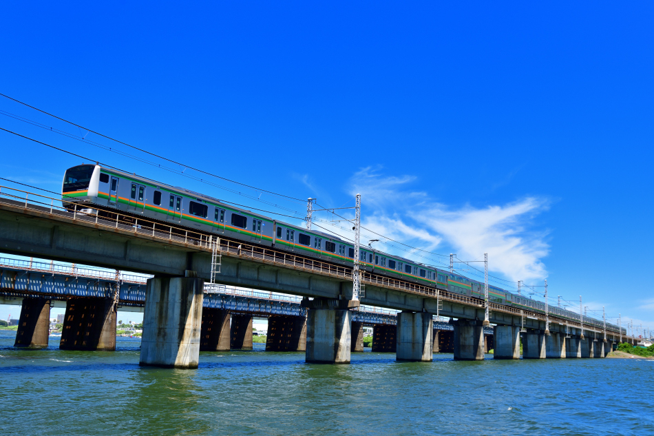 熱海 夏空の下,馬入川を渡る横コツ所属のE-08編成,後寄り5両は231系 (2025/07/22追加) |