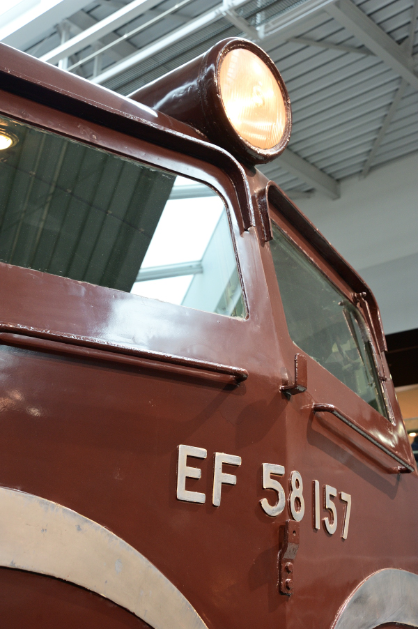 | No.D700_120104‐357 2012年1月4日 EF58 157 リニア・鉄道館 ぶどう色2号に戻された上,Hゴムから小窓に復元されています。上の写真と比較するとワイパーも原形に戻されていることがわかります。鉄博の89号機より写真は撮りやすい。 (2023/01/17ワイド化) |