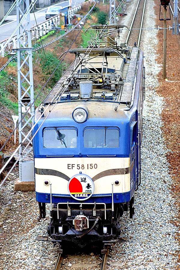 | No.85‐39 1985年1月3日 EF58 150 単機回送 東海道本線 芦屋→摂津本山 迎春ヘッドマークを上り方に取り付け単機で下る150号機。芦屋川西側の跨線橋からの追い写し。 (2005/07/18追加 2023/01/17ワイド化) |
