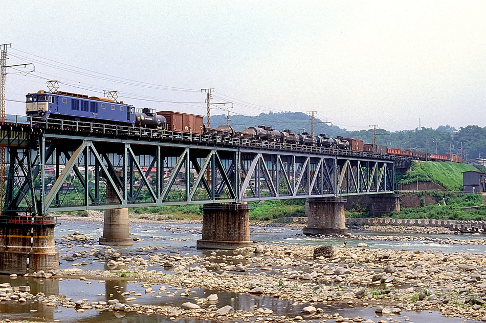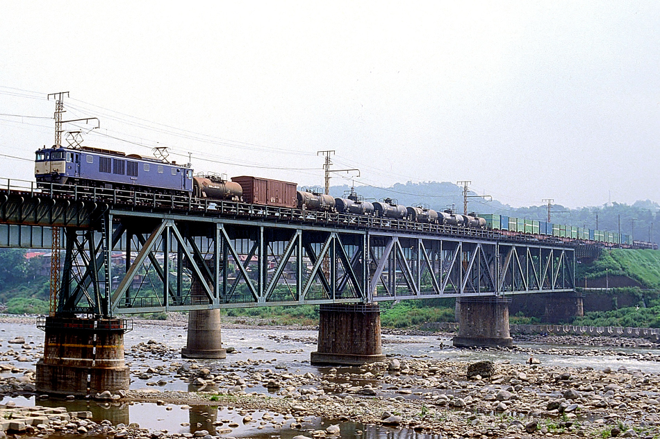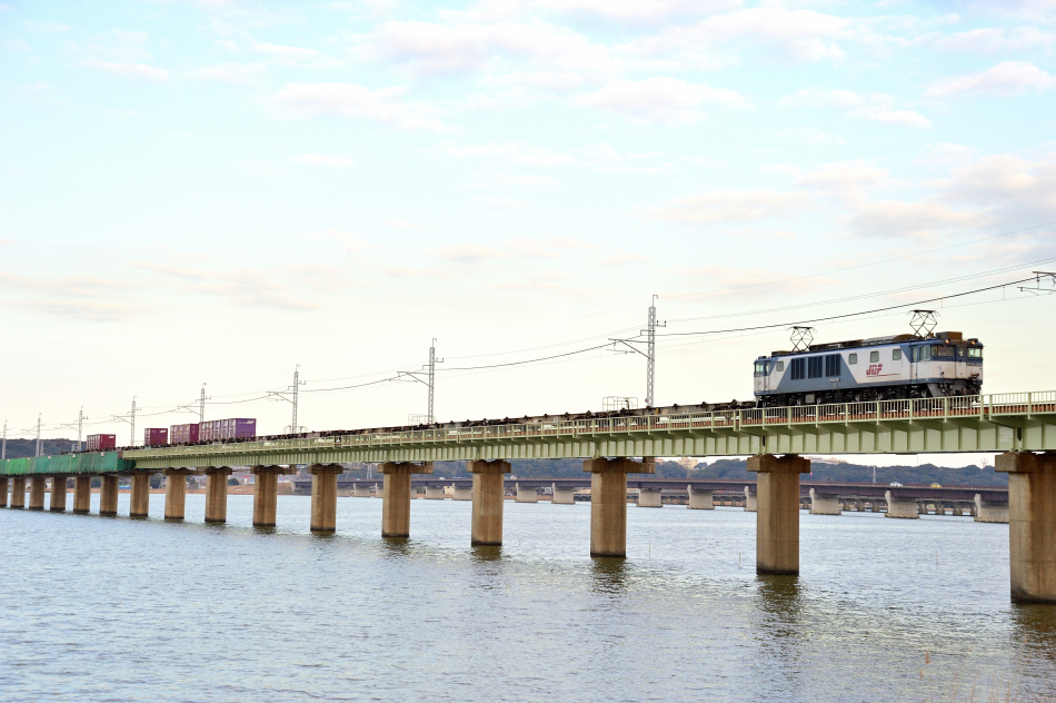 利根川鉄橋をゆく1022号機牽引貨物列車。1022号機は東洋電機・川崎重工によって製造され,1981年9月17日に落成しています。 (2023/02/03ワイド化) |