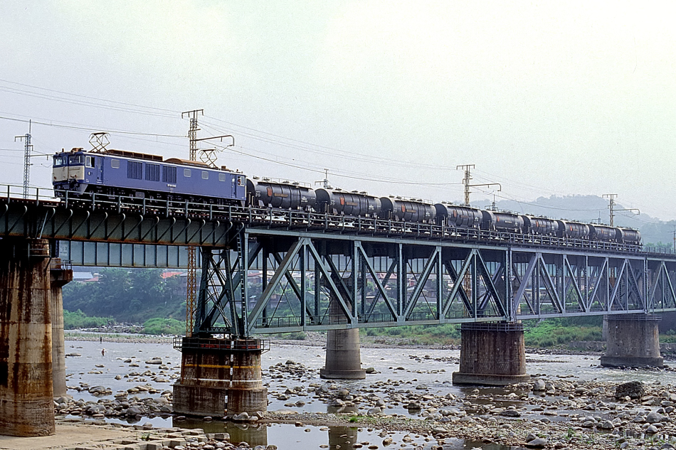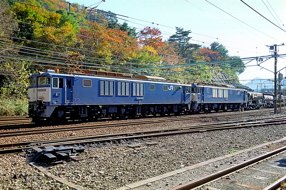 重連総括で日本石油輸送のタキ43000を牽引するEF64。1041は原色,次位の1020は貨物色。タキは黒と緑の混色。 (2013/03/23追加 2023/02/03ワイド化) |