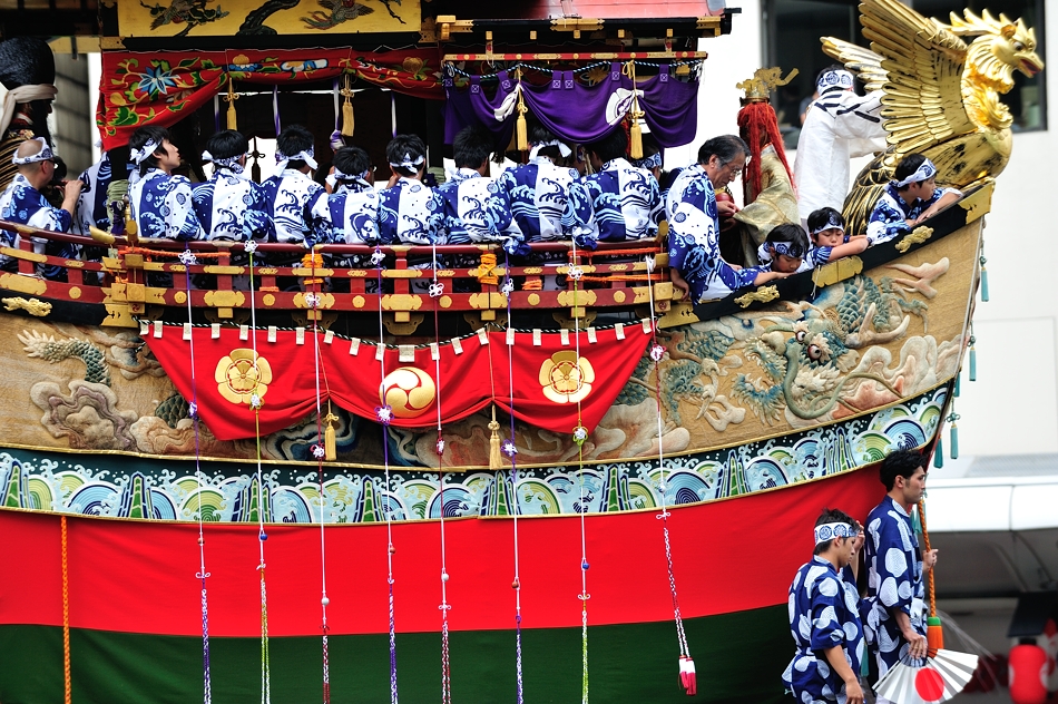 | 祇園祭には神功皇后の説話を基にした出陣船鉾(船鉾),凱旋船鉾(大船鉾)の二基があり,それぞれ前祭,後祭の殿(しんがり)を務める。神面を付けた神功皇后像と,住吉明神,鹿島明神,龍神・安曇磯良(あずみのいそら)が船に乗り巡行する。身ごもって出陣し戦後無事出産した神功皇后は安産の神とされ,皇后の神面は明治天皇ご誕生の折には宮中に参内するなど,深い信仰を集めている。 |