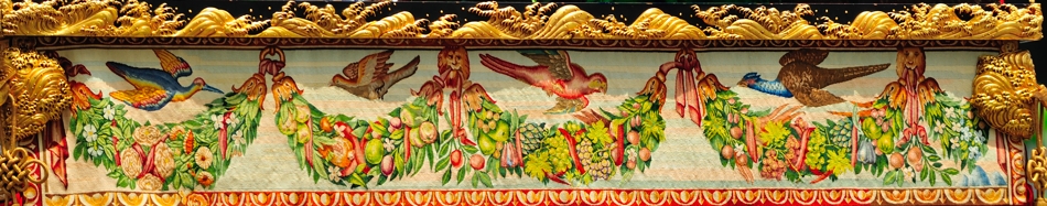 | 1枚のタペストリーを切り水引と胴懸に仕立てている。 |