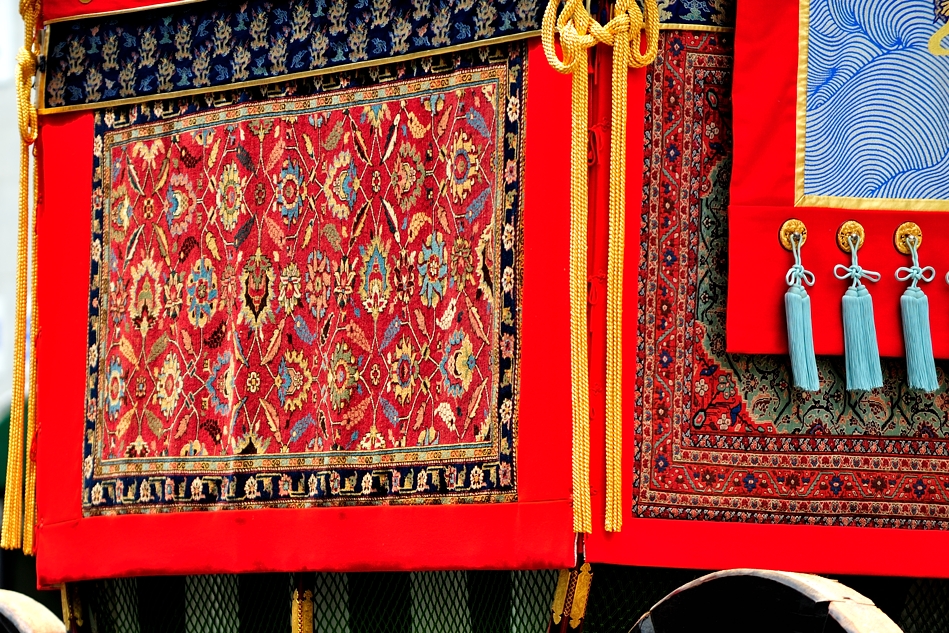 | 後祭巡行で四条通を西に向かって進行してきた南観音山。前懸は平成二十六年(2014)に復元新調された「異无須織(いむすおり)」ポロネーズ絨毯を使用。 |
