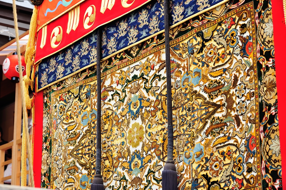 | 浴衣の似合う宵々山。前懸は近年復元新調された後懸「中東蓮花水辺に魚文様」ペルシャ絨毯を付けている。 |