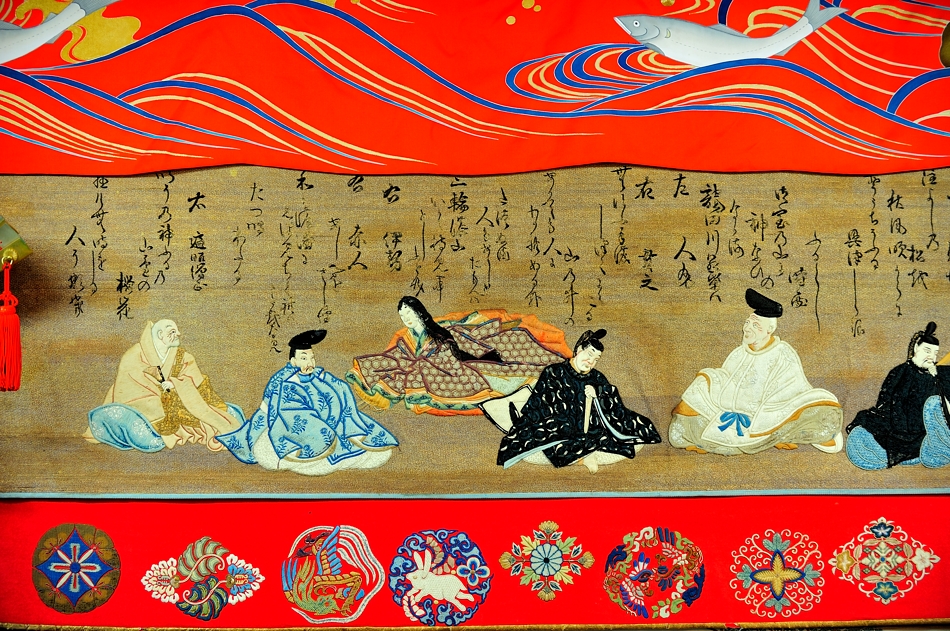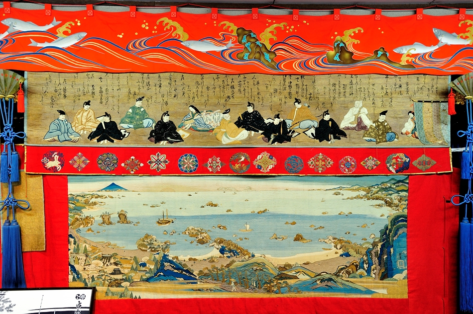 | 占出山は神功皇后が鮎を釣り戦勝の兆しを占った故事に由来し,神功皇后を祭神として祀っている。水引は平成二十五年(2013)に新調された「三十六歌仙」,前懸は「宮島」,左右の胴懸は「松島」と「天橋立」。 |