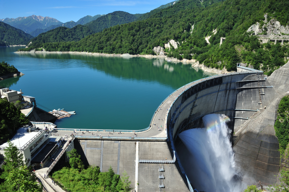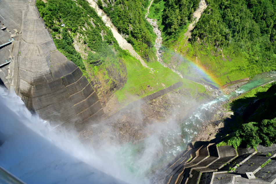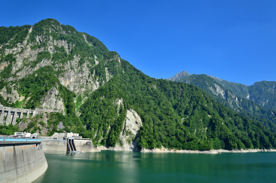 | 黒部ダムから望む赤牛岳・水晶岳 (画像タッチで山名表示) 2015/08/09 |