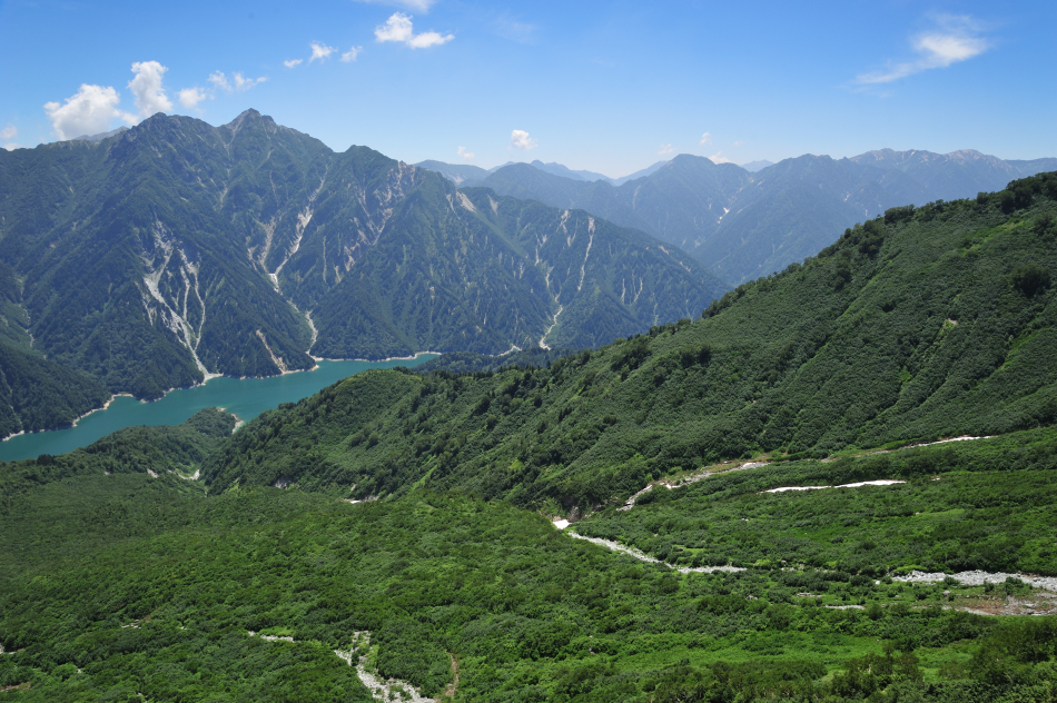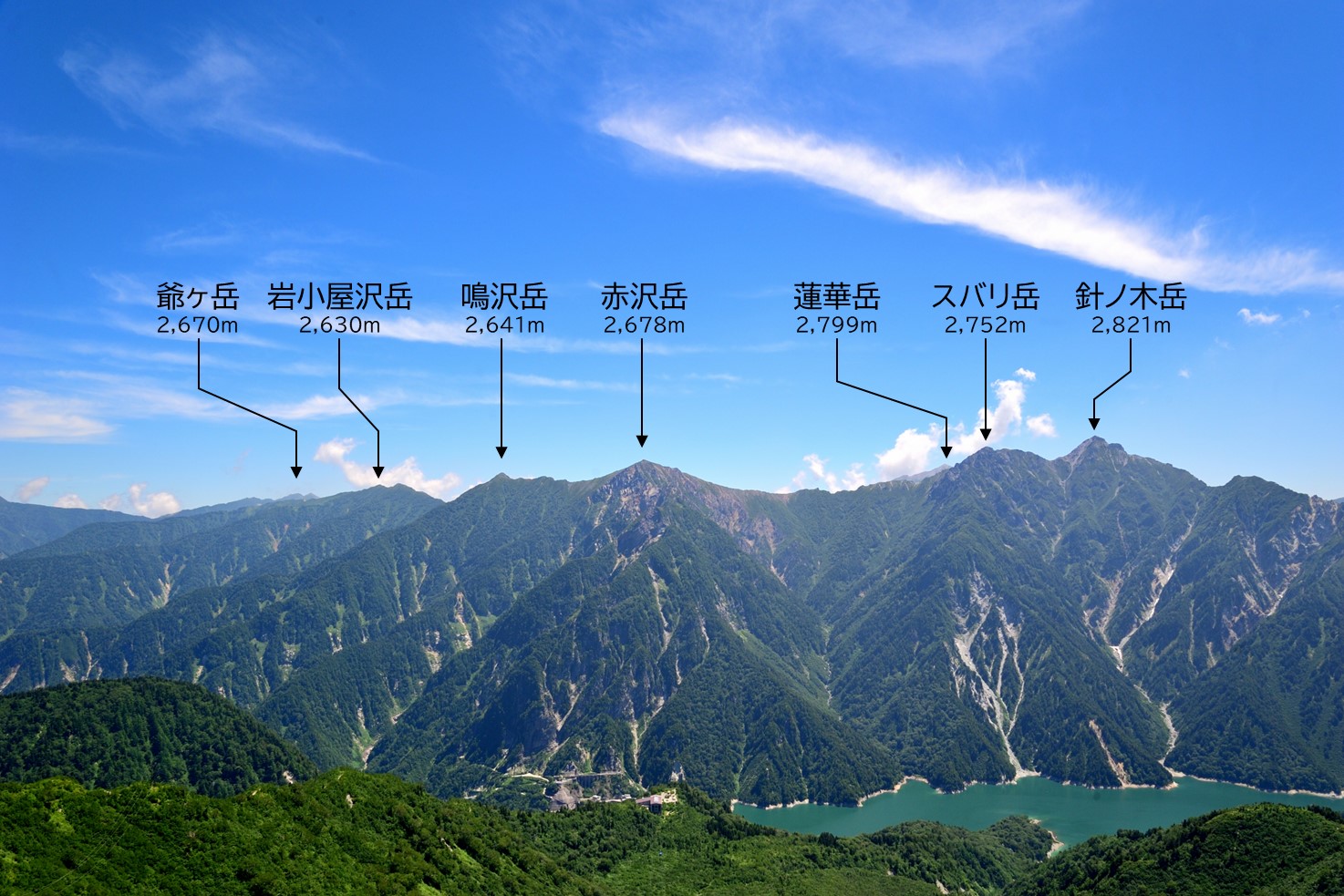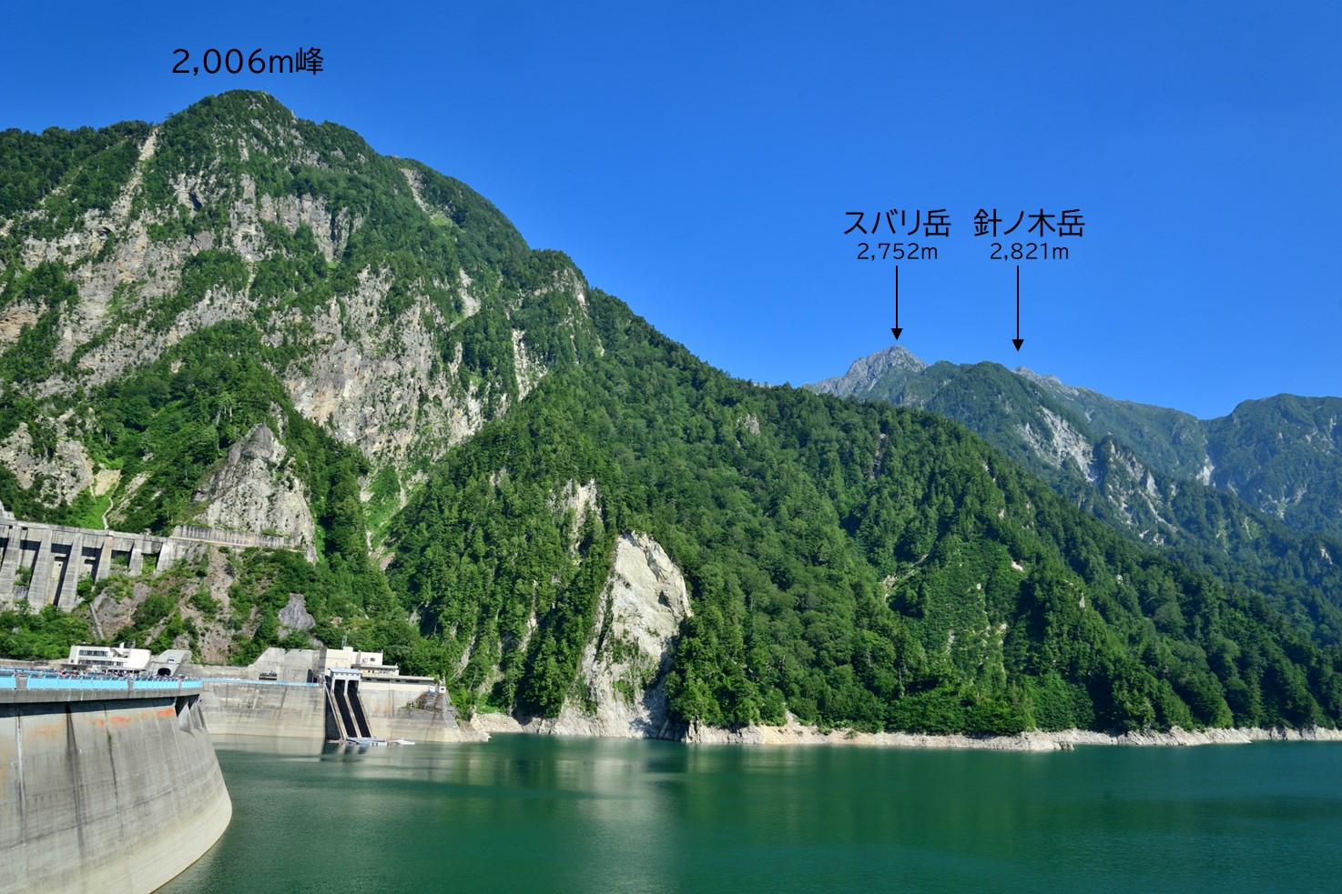 | 黒部湖と赤沢岳・スバリ岳・針ノ木岳 (画像タッチで山名表示) 2015/08/09 |