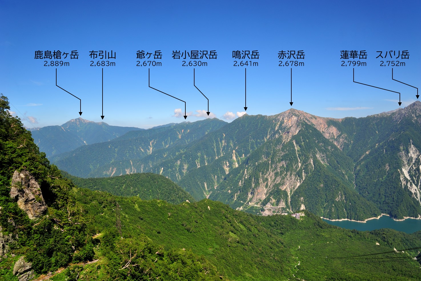 | 大観峰から望む鹿島槍ヶ岳〜スバリ岳 (画像タッチで山名表示) 2015/08/09 |