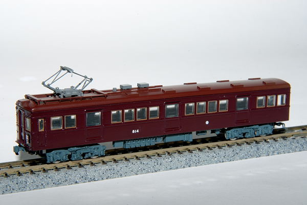 | 814 今津(大阪)方の先頭車。前パンの美しい形状をしています。鉄コレの塗装を落としてからジェイズの缶スプレーを吹きました。これは今回初めて使用しました。深みのある良い色が出ますが,圧力が強いので離れて吹くとゆず肌になります。また,裏面側が回り込んだ塗料でざらざらになるので,これを防止するためにファン2個を取り付けた塗装台を作成するなど結構苦労しました。連結器は鉄コレのダミーカプラーのままで,後位側はいろいろ試した結果,KATO蜜連カプラーとしました。ジオマトのインレタが定着せずこの工程でも四苦八苦しました。814のパンタはグレーに塗装してみました。 |