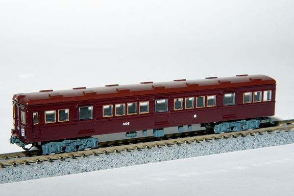 | 864 814とペアを組むTc車。運転室は存置しています。カプラーは当初KATOの自連を付けていたのですが,解放する時の勝手が異なるのと,ジャンパ線が欲しくなったため,KATO蜜連に変更し,中間はすべてこの蜜連で統一しました。インレタはあまりの食いつきの悪さに挫折し,クリアデカールに一旦転写してから車体に貼り付ける方法を採りました。この方法は,前面への取り付けは特に楽になりますが,クリアデカールの枠が見えてしまいますので,一長一短があります。トップコートの吹き付けはサボっております。 |