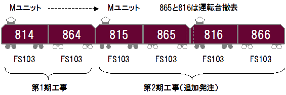 | 右図のように,当初導入した2両を第1期工事にて814+864としました。左側が今津(大阪)側です。当然ながらM車は814。その後,第2期工事として,815+865-816-866を追加発注し,Mユニットを815に移設,今津線の6両を再現することにしました。編成については当鉄道局の実車ページを参照ください。 | ![]() |