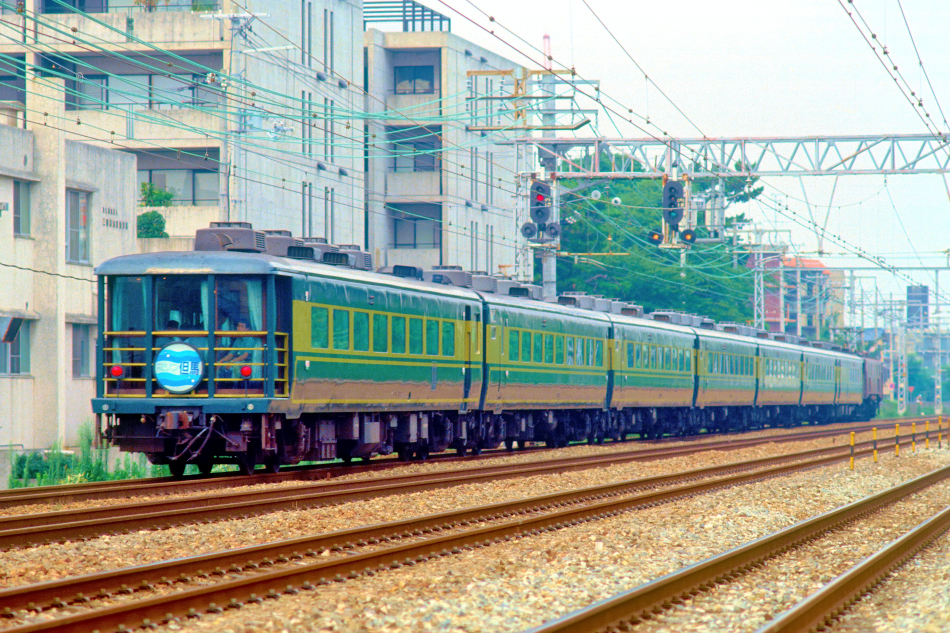 「みやび」は鷹取工場において1986(昭和61)年に改造され,同年4月1日から営業運転を開始した7両編成の和式客車。編成はスロフ14‐801+オロ14‐801+オロ14‐802+オロ14‐803+オロ14‐804+オロ14‐805+スロフ14‐802となっており,4号車のオロ14‐803に日本庭園と和風サロンを備えています。残念なことに同年12月29日に餘部鉄橋からの落下事故で廃車されたので,ほとんど撮影する機会がありませんでした。 (2022/09/21ワイド化) |