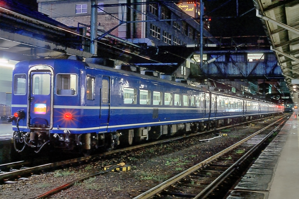 釧路から早朝の札幌に到着した「まりも」。雪害対策のため道内では折戸は使えず,引戸化した500番台車が大活躍。14系寝台車も同様に改造され連結していました。札幌では函館,釧路,網走,稚内へと放射状に夜行急行が発着しており,14系は当時,北海道ワイド周遊券で夏休みを過ごす学生達の強い味方となっていました。 (2022/09/21ワイド化) |