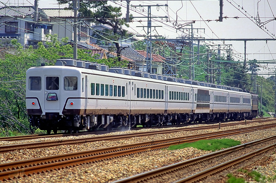 1988年にJR西日本が主に「シュプール号」で使用するために改造した番台。窓の下部は鮮やかな赤色,JR西日本カラーの青細帯が巻かれています。 (2022/09/21ワイド化) |