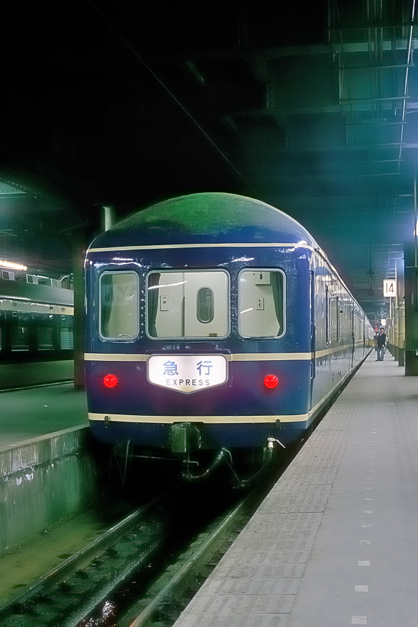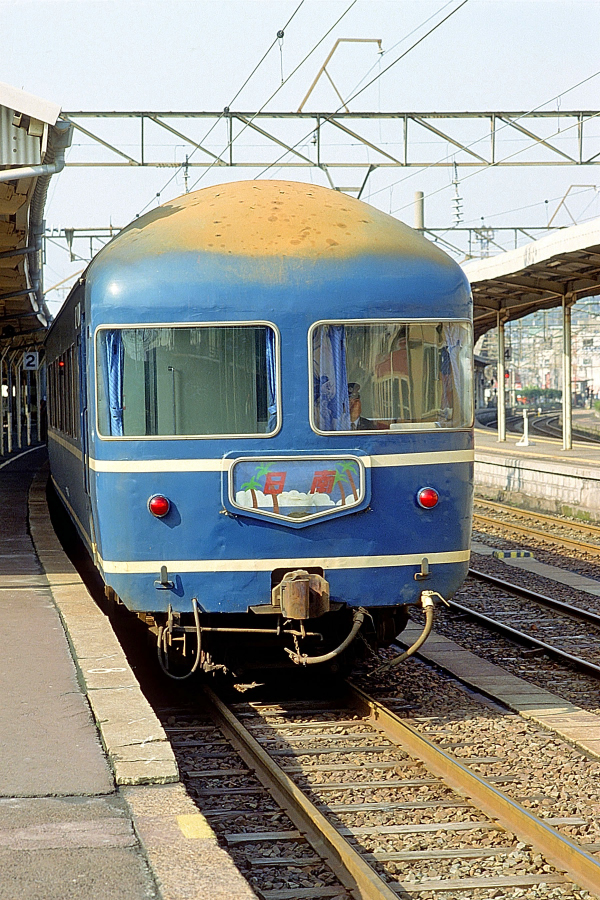 | No.123‐18 1986年3月20日 ED76+20系 ナハネフ22 1000番台 急行 日南 日豊本線 鹿児島 絵入りテールサインの日豊本線周りの夜行急行「日南」。一般形客車で運転されていた急行「日南」は1978年3月15日から鹿児島本線の急行「かいもん」とともに12系+20系の混成編成に置き換えられました。20系のサービス電源をスハフ12から供給するための変圧器が搭載され,「日南」「かいもん」用の20系客車は1000番台を名乗っていました。 (2022/09/23ワイド化) |