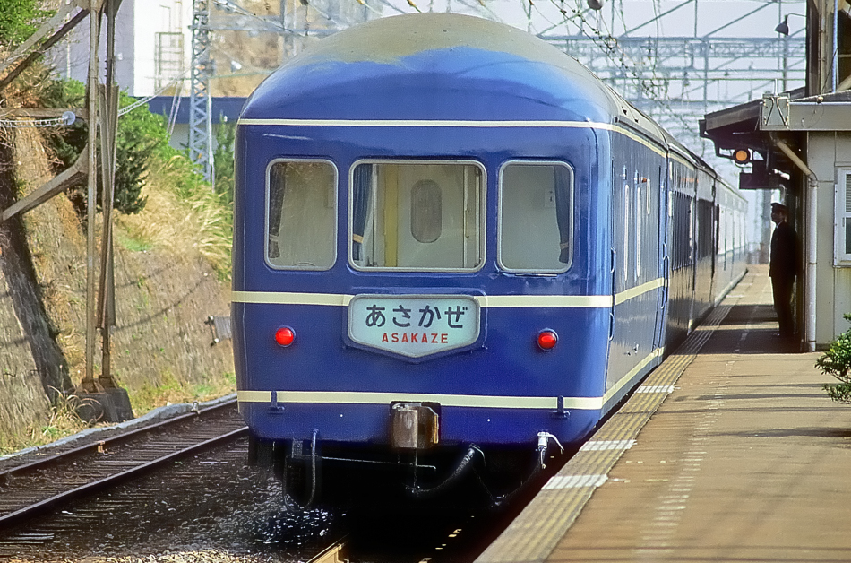 EF65PFに牽引され根府川を通過する「あさかぜ52号」で貫禄のオリジナルテールサインを掲出するカニ21。当時は臨時特急の愛称は50番台でした。 (2022/09/23ワイド化) ![]() |