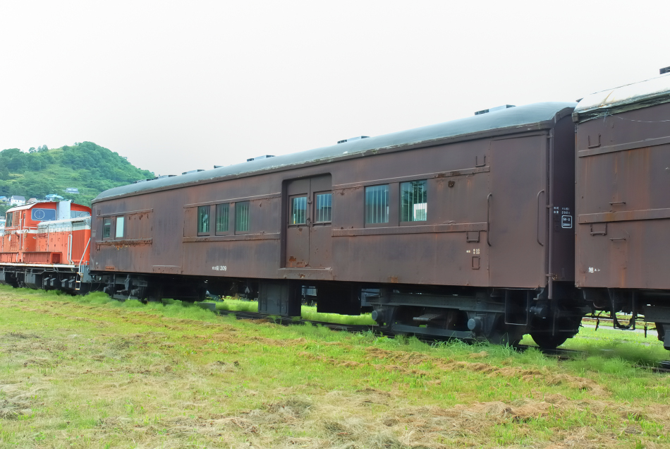 手宮に保存されているオエ61 309。オエ61形300番台(301〜319)は,マニ50の登場で余剰となったマニ36を改造して救援車オエ61に編入したグループで,1980年から1984年に製造されました。したがってもともと鋼体化改造車ではなく,元をたどれば狭窓丸屋根のオロ35