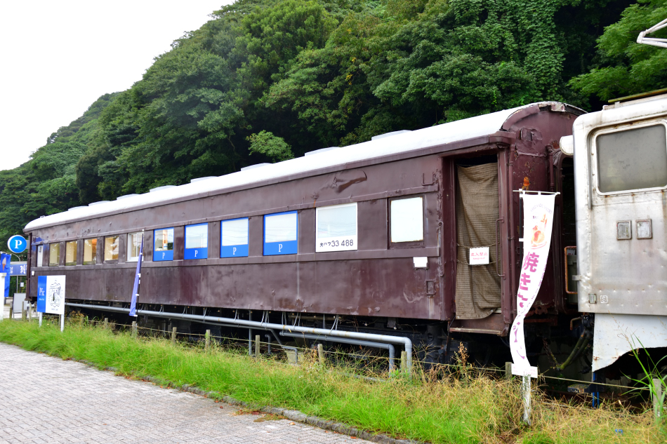 EF30 1に連結され和布刈(めかり)公園に保存されているオハフ33 488。外装はかなり傷みが出ており扉もない状態。内装についても椅子等を撤去して改装し店舗にしており文化財保護の観点からいかがなものかと問題になっていました。 (2025/10/21追加) |