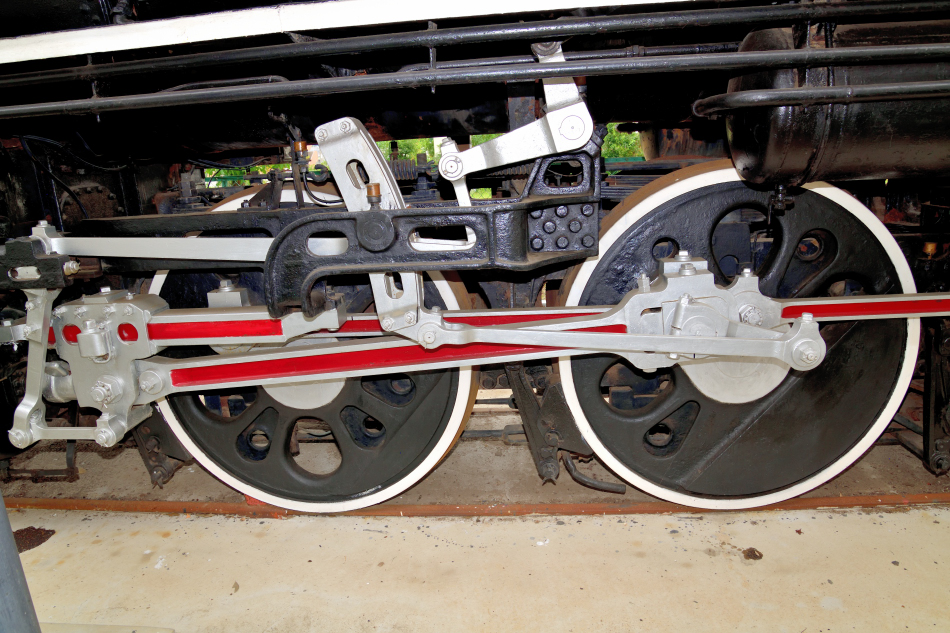 公式側,美しく整備された動輪周辺。動輪はコロの上に載っており,圧縮空気で動作するように工夫されています。 (2024/09/10追加) |