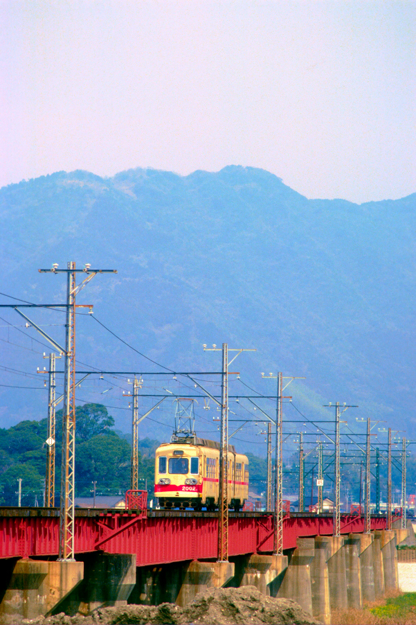 | No.122‐02 1986年3月17日 2000形 2002A+C+B 普通 筑豊直方行 筑豊電鉄 筑豊直方←感田 長大な遠賀川橋梁を渡る2002。3車体4台車連接固定編成となっており,全長は25,300mmあります。前側が2002Aで前寄りにパンタグラフを搭載しています。 |
