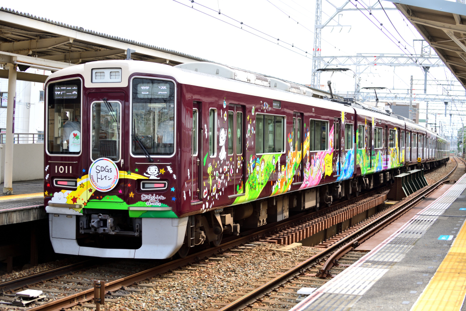大阪梅田 1011‐1511‐1611‐1061‐1161‐1561‐1661‐1111 神戸三宮 芦屋川を出る神戸三宮行き1011F。SDGsトレインのヘッドマークとラッピングが施されています。 (2024/07/07追加) ![]() |