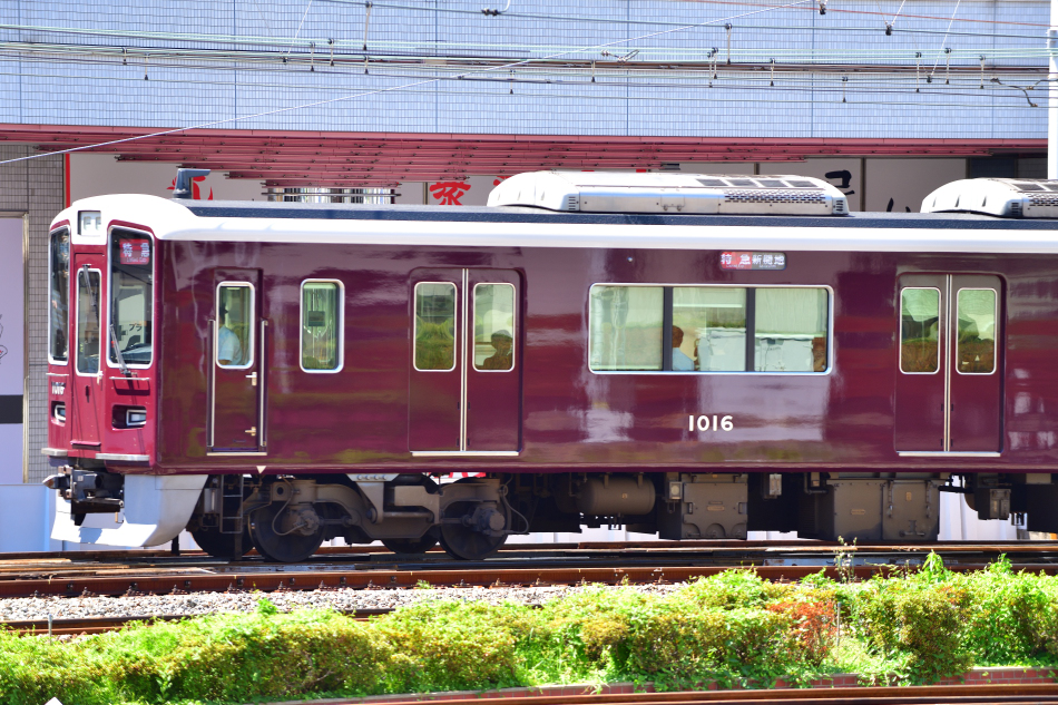 大阪梅田 1016‐1516‐1616‐1066‐1166‐1566‐1666‐1116 新開地 折り返し新開地行き特急となる神戸線の梅田行特急。1000系は側面種別と行先表示を一体化したフルカラーLED表示器を採用しています。 |