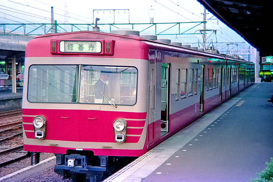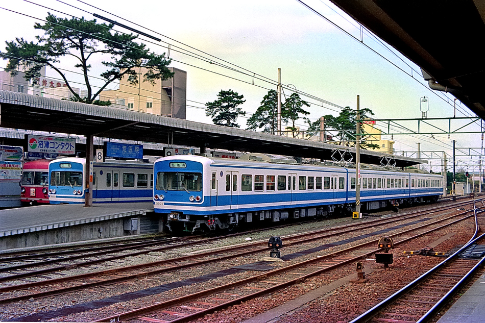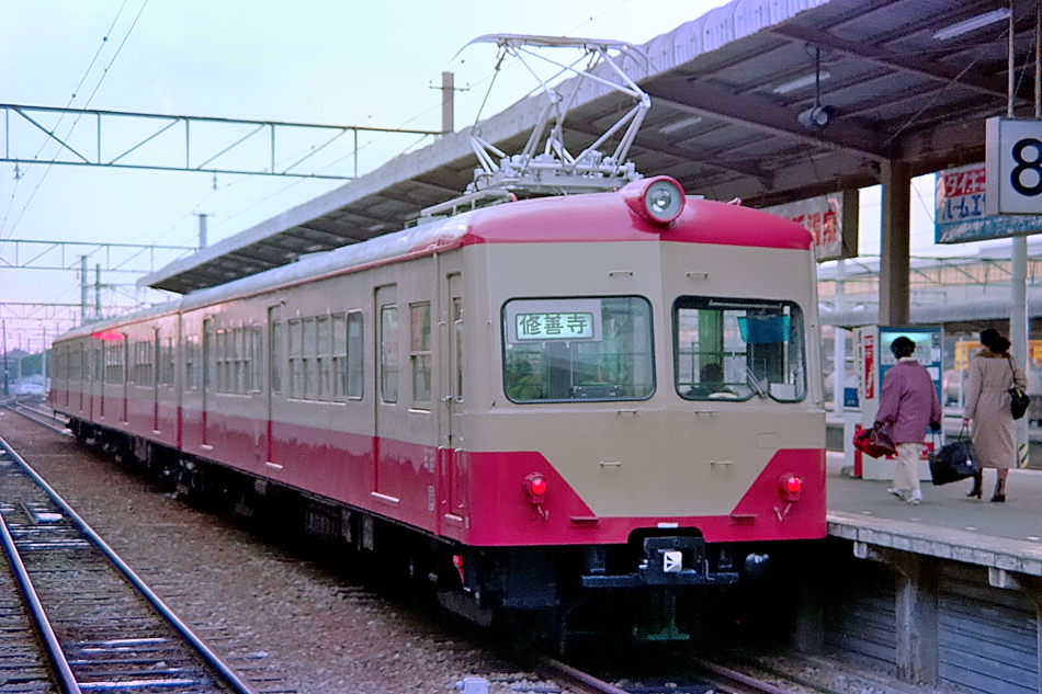 三島 モハ1000形‐サハ2000形‐モハ1000形 修善寺 1000系はオリジナル車の編成と西武鉄道から譲渡された501系を改番した編成とがあり,これは後者の方で,前面にナンバー表記がなく編成を絞り込めません。なお,Nikon FEを初めて使用した写真。 (2024/05/03ワイド化) |