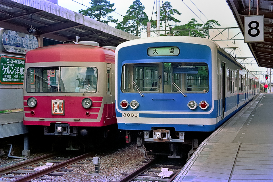 左 三島 モハ1003‐モハ1004‐クハ2002 修善寺 中央 三島 クモハ3003‐モハ3004‐クハ3502 大場 右 三島 クモハ3001‐モハ3002‐クハ3501 修善寺 ターミナル三島駅における1000系と3000系3編成の並び。 (2024/05/03シャドー調整) |