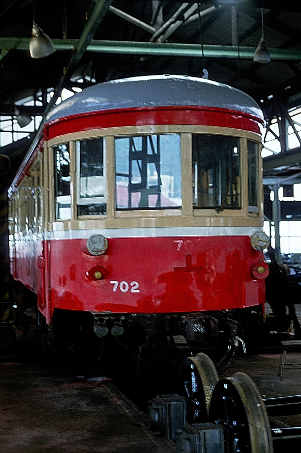 | No.140‐19 1986年12月14日 キハ702 片上鉄道 片上車庫 <鉄研車庫見学会> 検査で塗装工程に入っていたキハ702。正面にも薄く702のナンバーが見えます。 (2018/01/16日付修正 2022/07/24ワイド化) |
