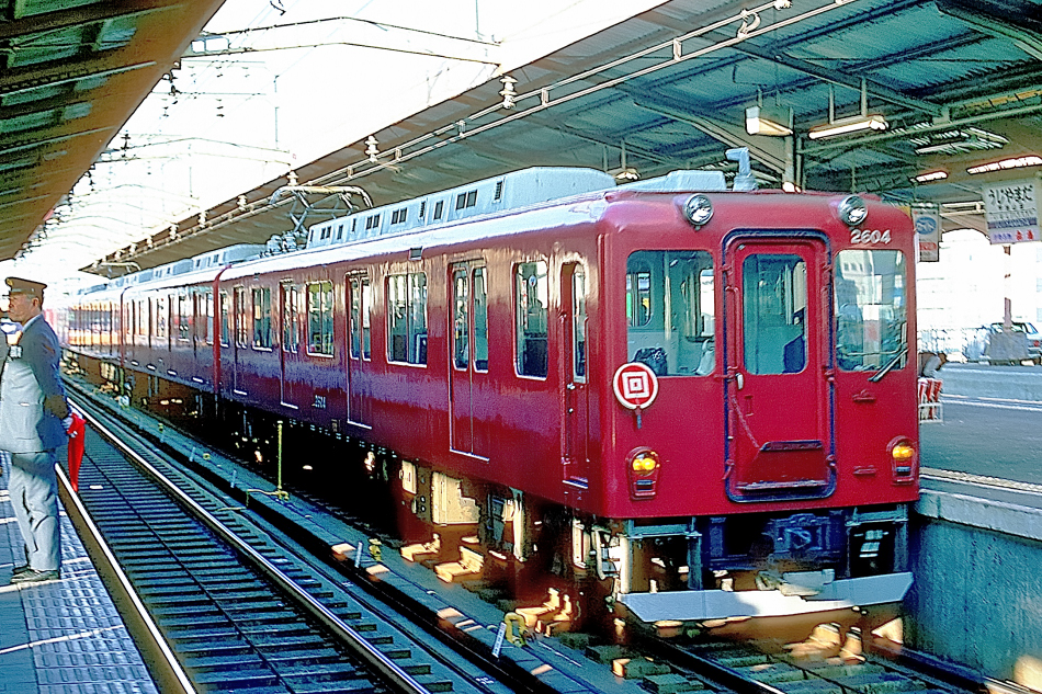 上本町 系列不明4両+ク2704‐モ2604 鳥羽 初詣で賑わう宇治山田に到着した回送列車。2600系は1970年に登場した4扉車で,急行列車用として固定式クロスシートを備えています。4両編成2本,2両編成2本がありましたが2004年までに全廃されました。 (2024/04/08ワイド化) |