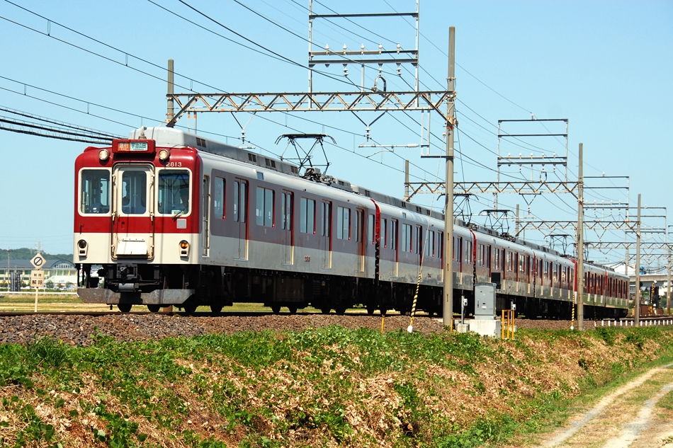 近鉄名古屋 ク2901‐モ2851‐モ2801 白塚 前パンタを掲げて快走する2800系白塚行きトップナンバー,モ2801他3両。2800系は2610系のロングシートバージョン。AX01‐AX04, AX09は3両編成。 |