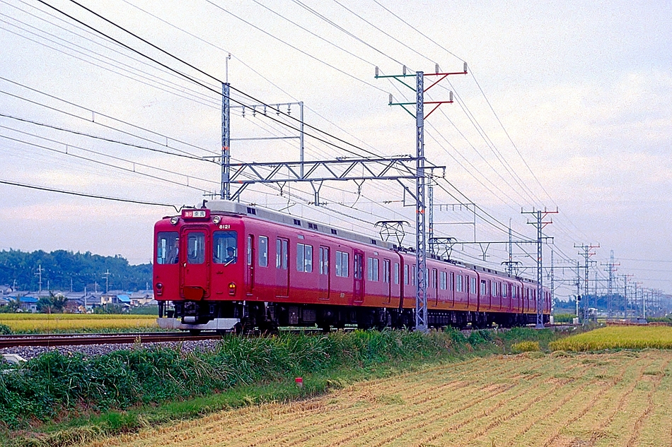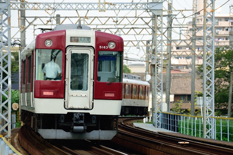 近鉄名古屋 系列不明2両+ク5108‐モ5208‐モ5258‐ク5158 宇治山田 ク5158を先頭に快走する6連の宇治山田行き急行。手前4両が5200系。 |