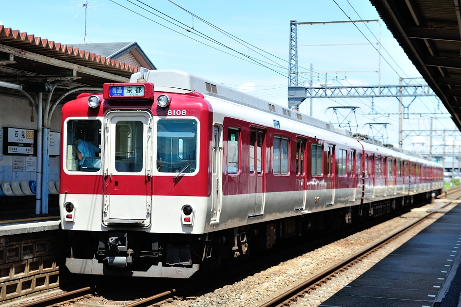 京都 モ8608‐サ8158‐モ8658‐ク8108 橿原神宮前 石見に到着する普通京都行き。8600系X58編成4両。 (2018/08/19追加 2024/04/15シャドー調整) |