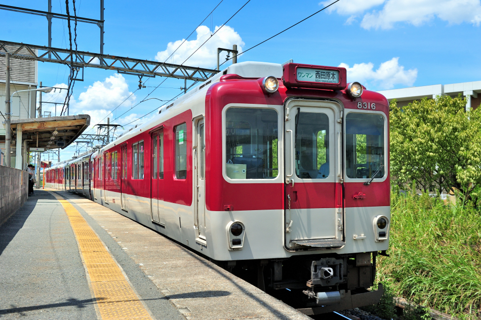 大和西大寺 ク8922‐モ8822‐モ8821‐ク8921 橿原神宮前 FL22編成の4両による普通。8810系は1981年から製造された4両編成の界磁チョッパ制御車で,京都方からク8910偶(Tc)‐モ8810偶(M)‐モ8810奇(M)‐ク8910奇(Tc)の編成となっています。 (2018/08/18追加) |