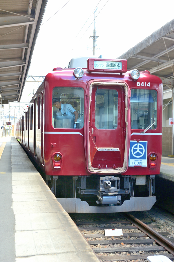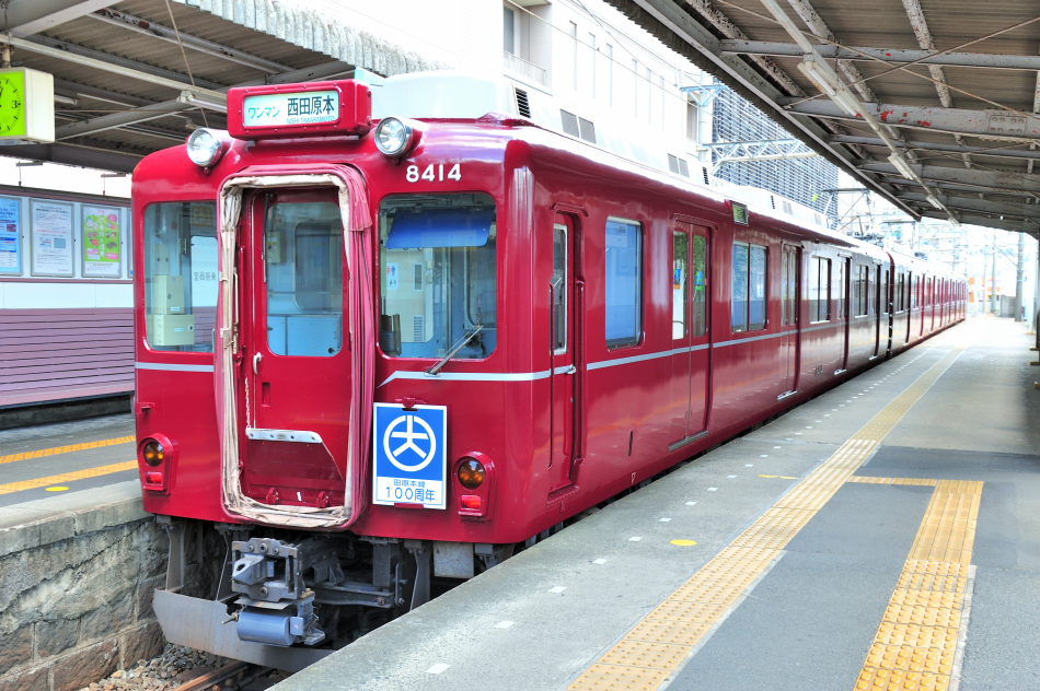 新王寺 モ8414‐モ8464‐ク8314 西田原本 降車ホーム側からの復刻塗装編成。 (2018/09/08追加 2024/04/15シャドー調整) |